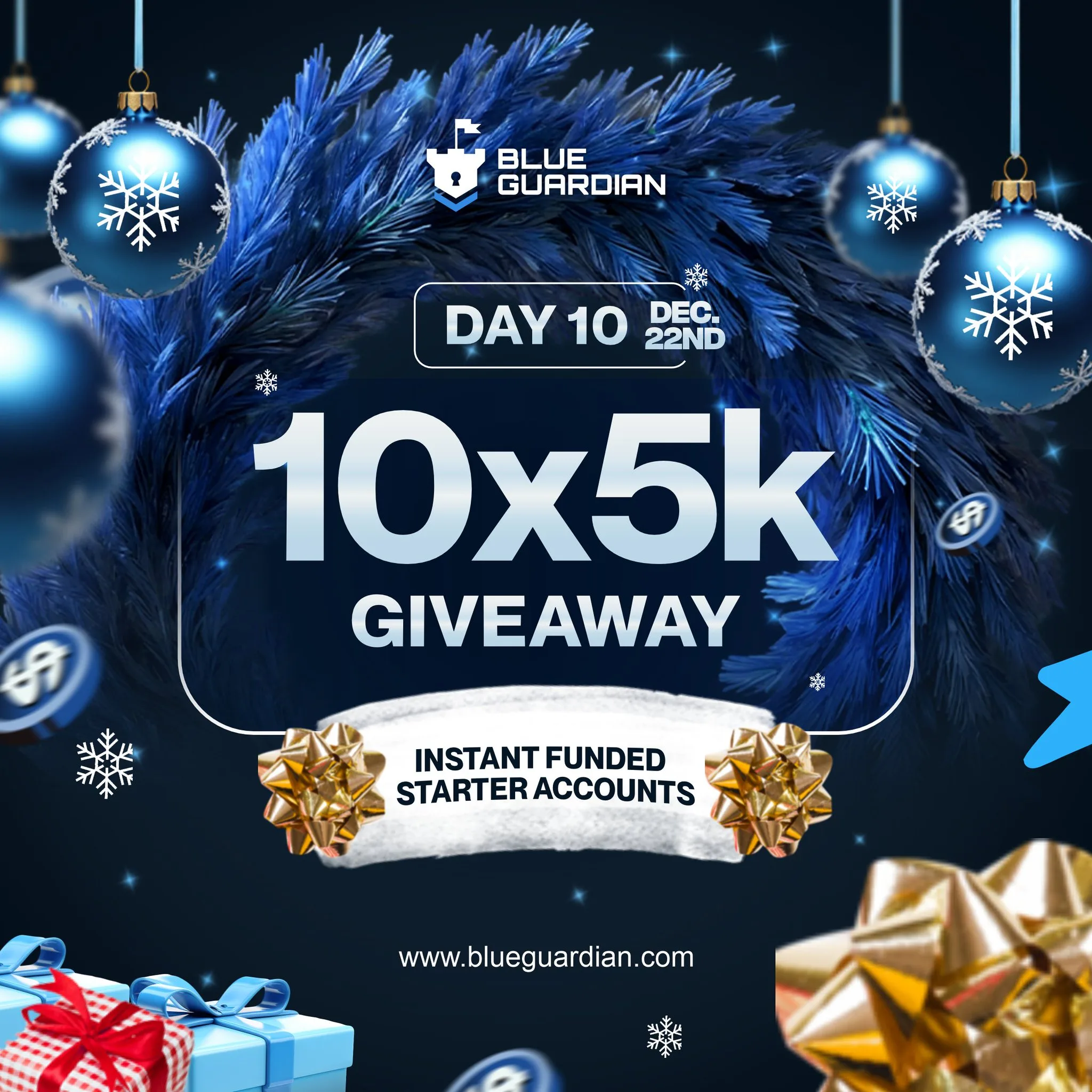 Blue Guardian rozdaje 10 kont Instant Funded (natychmiastowych, bez challengu) o wartości 5000 USD każde w ramach swojego kalendarza adwentowego!