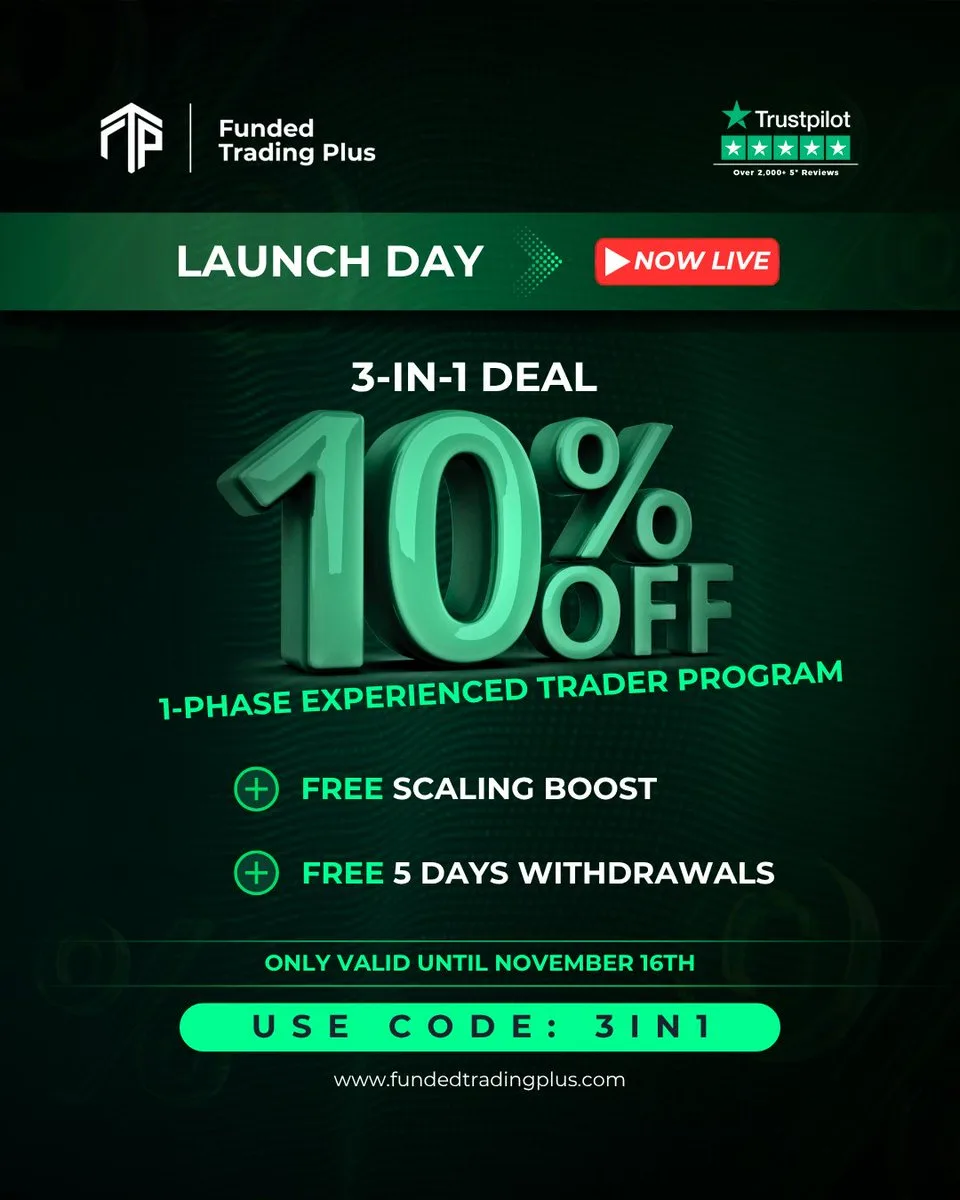 Prop firma Funded Trading Plus wprowadza specjalną promocję dla traderów, oferującą 10% zniżki na program dla doświadczonych traderów. Oferta jest dostępna tylko do 16 listopada 2025 roku.