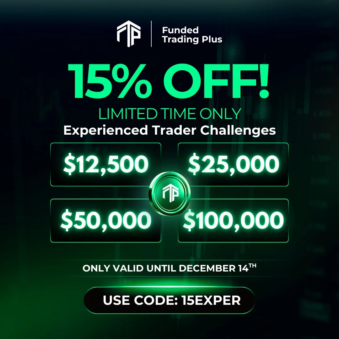 Funded Trading Plus oferuje 15% zniżki na wyzwanie 1-Step Experienced Trader Challenge. Promocja trwa do 14 grudnia 2025 roku.