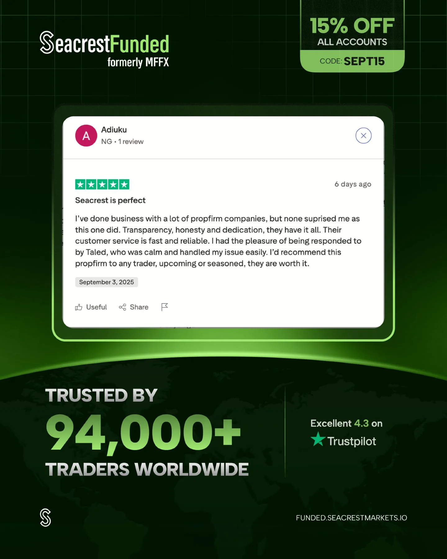Seacrest Markets oferuje 15% zniżki na wszystkie konta proptradingowe! Skorzystaj z tej okazji i dołącz do ponad 94,000 traderów na całym świecie.