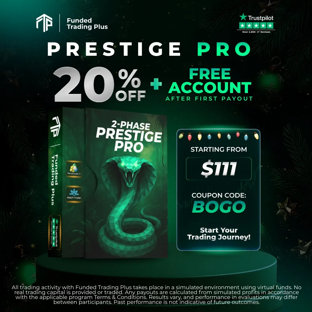 Funded Trading Plus oferuje promocję na konta Prestige Pro. Do niedzieli, 14 grudnia 2025 roku, możesz skorzystać z kodu rabatowego i otrzymać 20% zniżki oraz darmowe wyzwanie o tej samej wartości po pierwszej wypłacie.