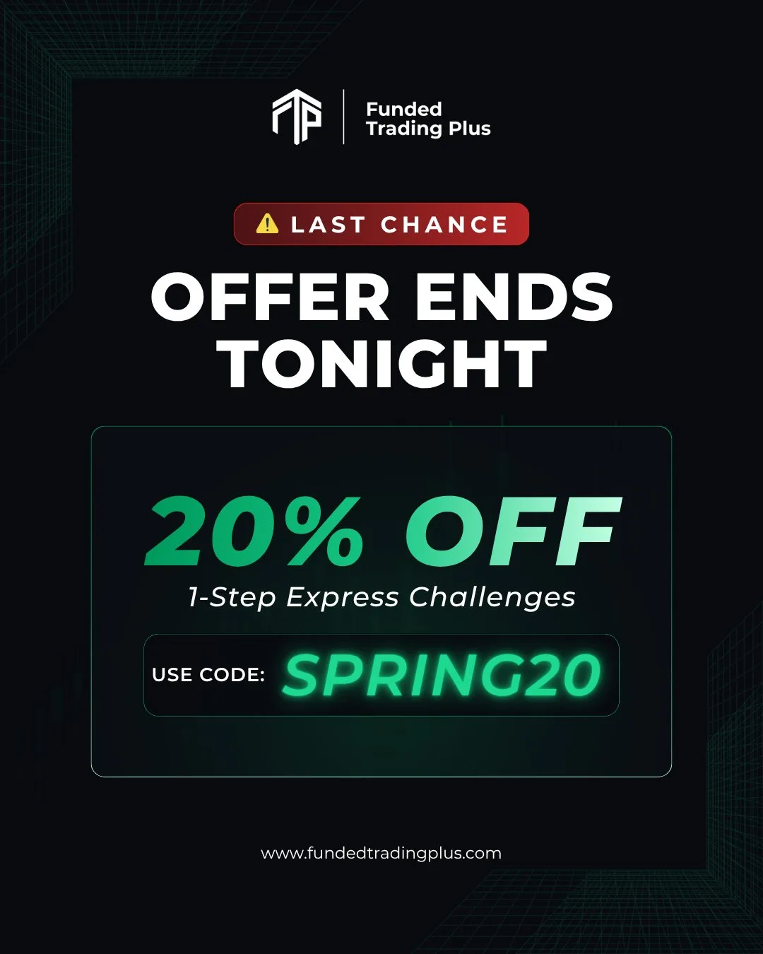Firma prop tradingowa Funded Trading Plus uruchomiła pilną promocję, oferując ostatnią szansę na uzyskanie 20% zniżki na wyzwania typu 1-Step Express Challenge, dostępne nawet do kwoty $100K.