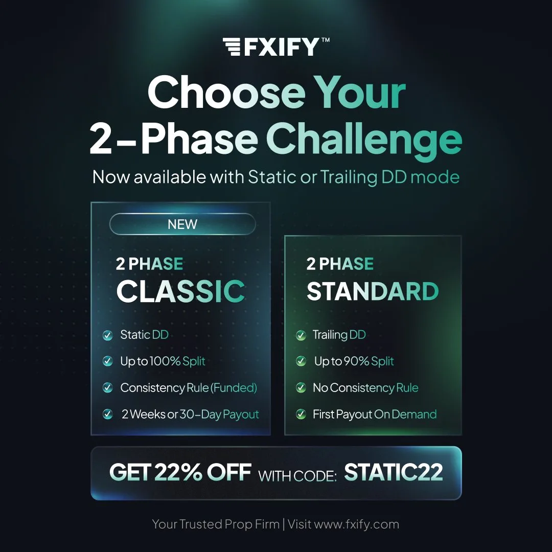 Aby skorzystać ze zniżki 22%, użyj kodu rabatowego STATIC22. To doskonała okazja, by przetestować nowy system, o którym więcej przeczytasz w artykule Fxify: Nowy 2-Phase z do 100% splitem.