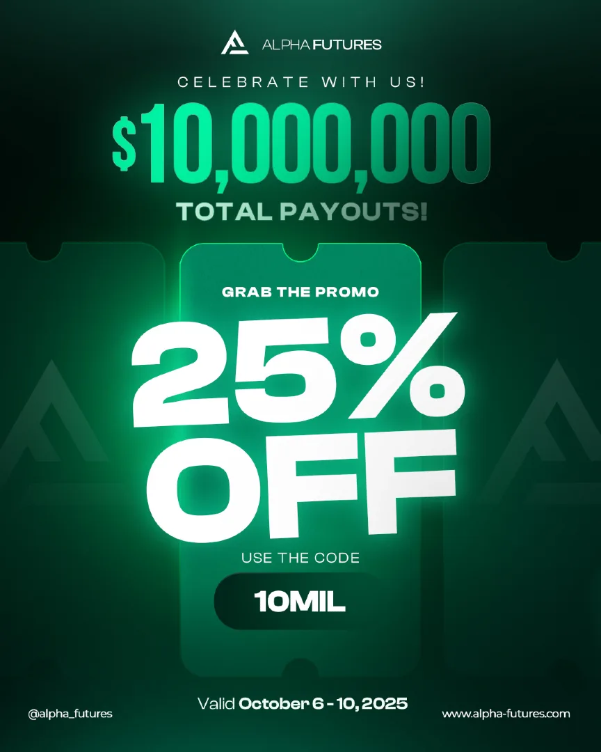 Alpha Futures świętuje wypłatę 10,000,000 dolarów dla traderów i oferuje 25% zniżki na wszystkie ewaluacje. Firma, znana z korzystnych warunków, jest jedną z ciekawszych opcji na rynku, o czym możesz przeczytać w naszej szczegółowej recenzji Alpha Futures.