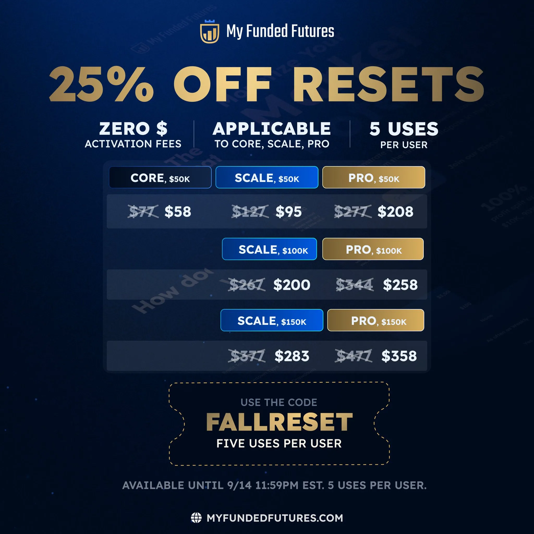My Funded Futures oferuje 25% zniżki na resety kont Core, Scale i Pro. Promocja trwa do 14 września 2025.