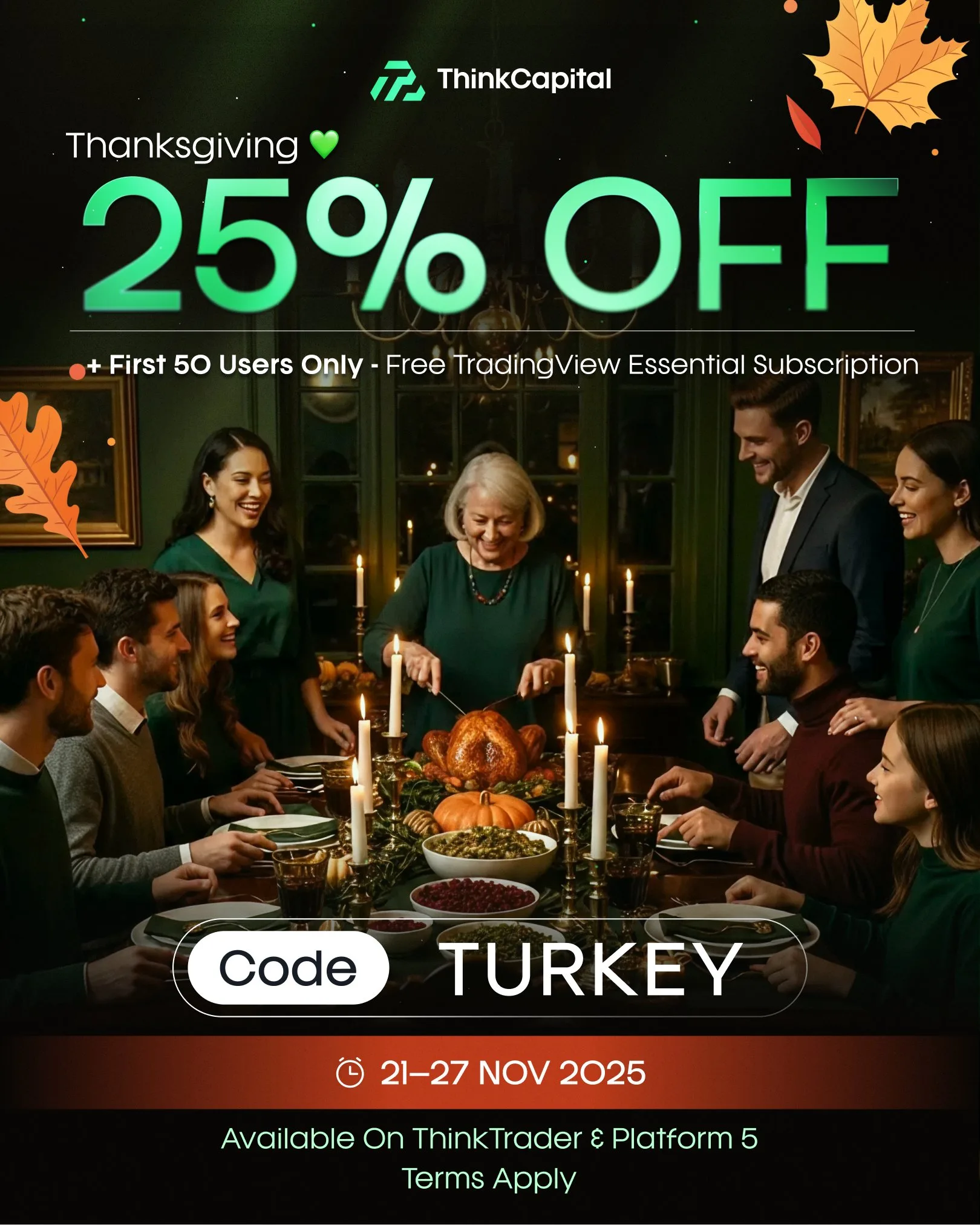 Z okazji Święta Dziękczynienia, firma proptradingowa Think Capital oferuje zniżkę 25% na wszystkie wyzwania. Dodatkowo, pierwszych 50 osób, które użyją kodu rabatowego otrzyma darmową subskrypcję TradingView Essential.