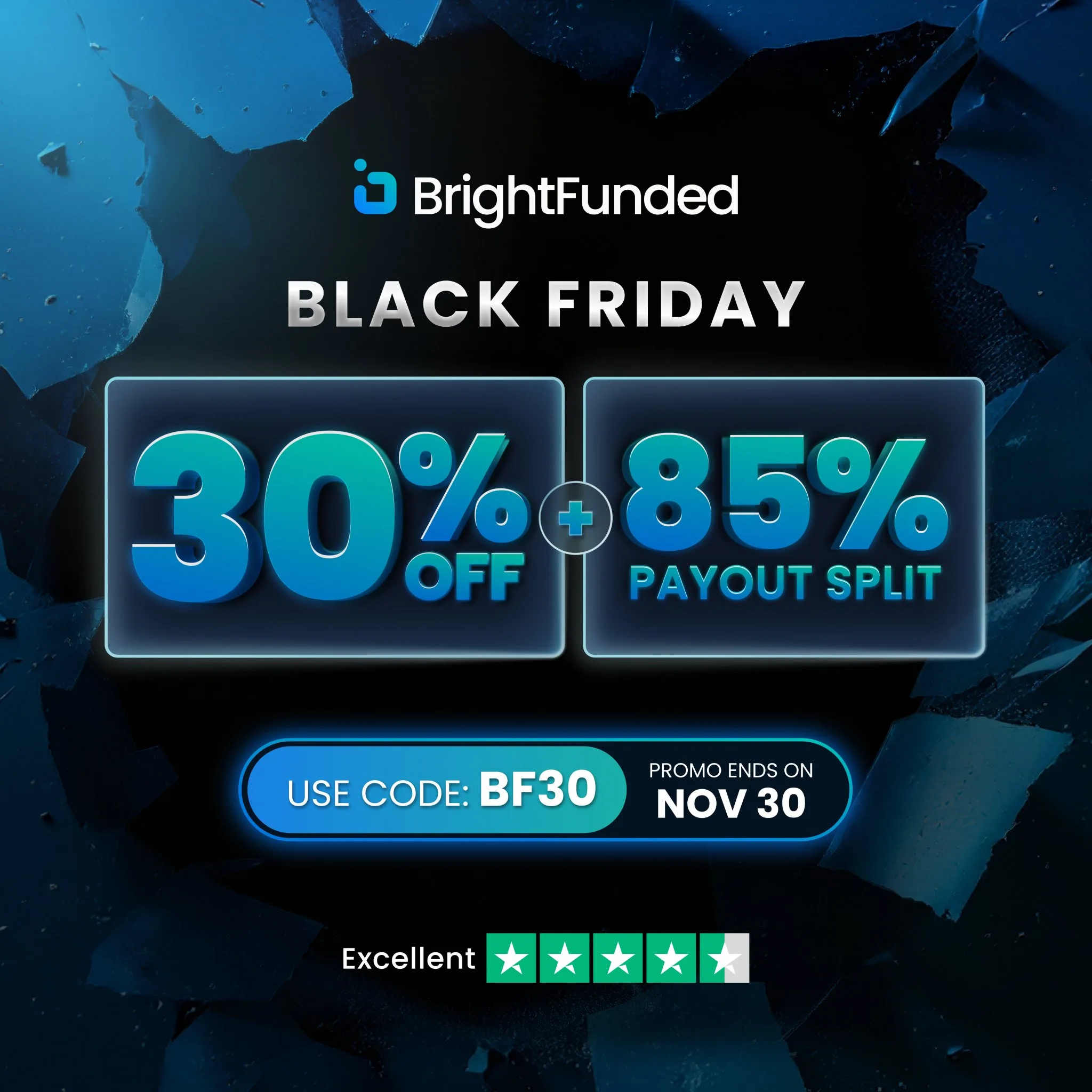 BrightFunded ogłasza promocję z okazji Black Friday! Możesz otrzymać 30% zniżki oraz 85% payout split.