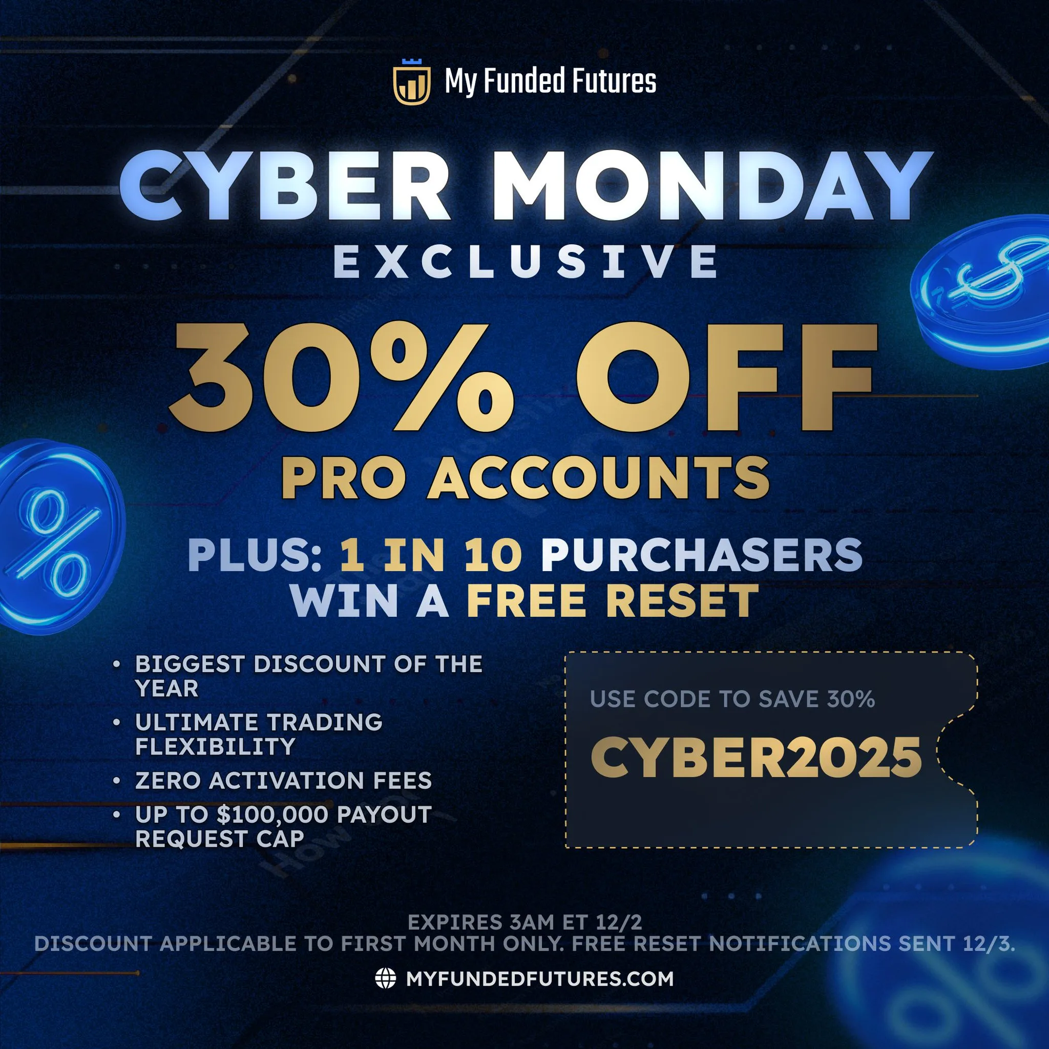 My Funded Futures oferuje z okazji Cyber Monday 30% zniżki na konta PRO. Użyj kodu CYBER2025.