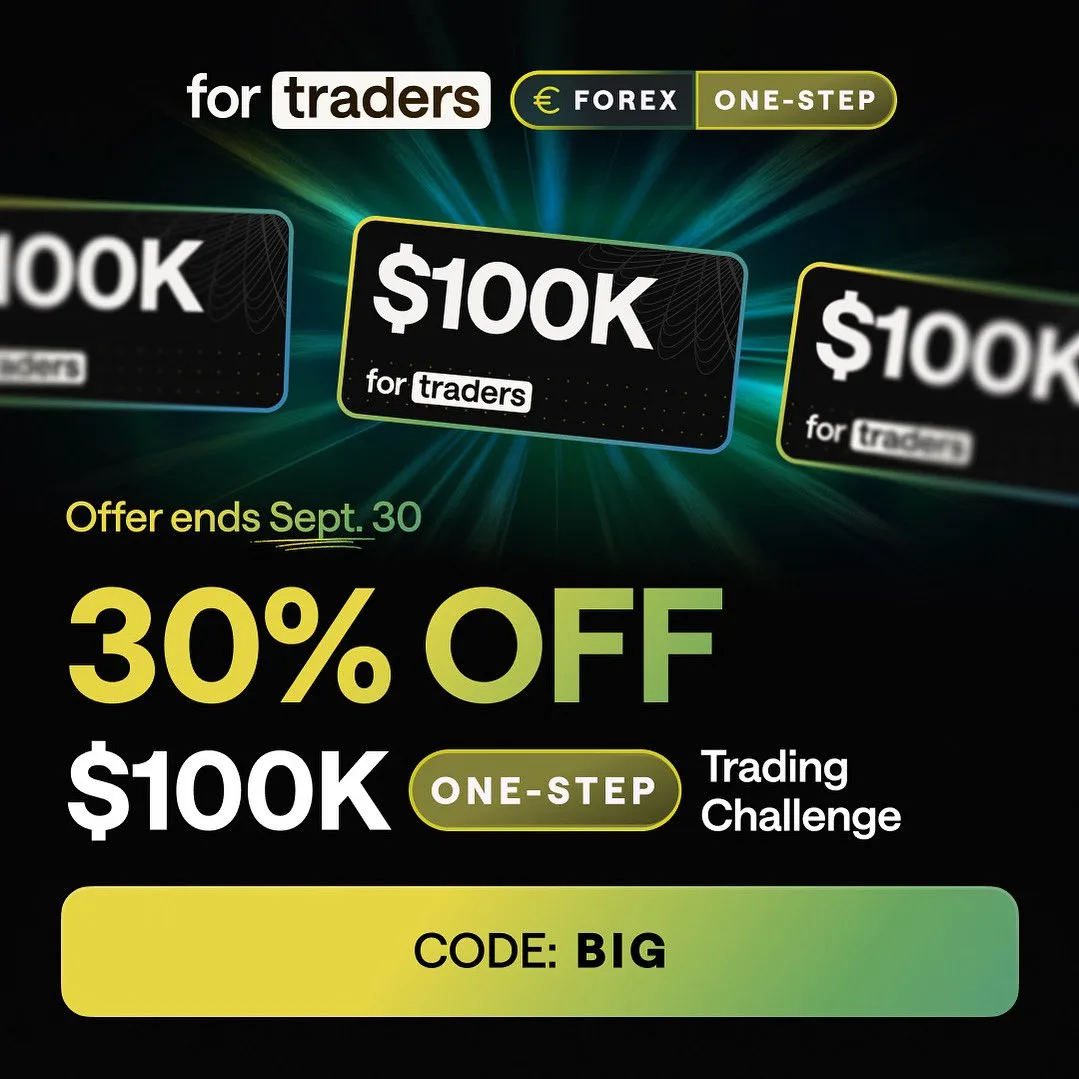 For Traders oferuje 30% zniżki na wyzwanie One-Step o wartości $100,000. To doskonała okazja, aby przejść na wyższy poziom i handlować większym kapitałem.