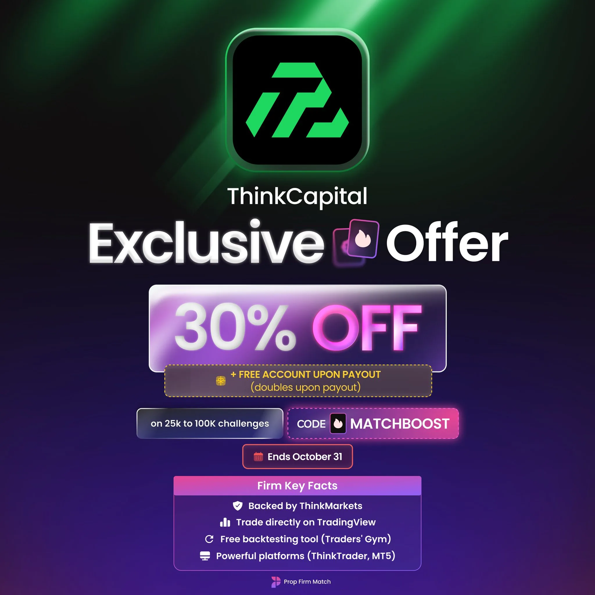 Firma proptradingowa Think Capital oferuje ekskluzywną promocję na cały październik. Tylko do 31 października 2025 możesz skorzystać z poniższych korzyści: