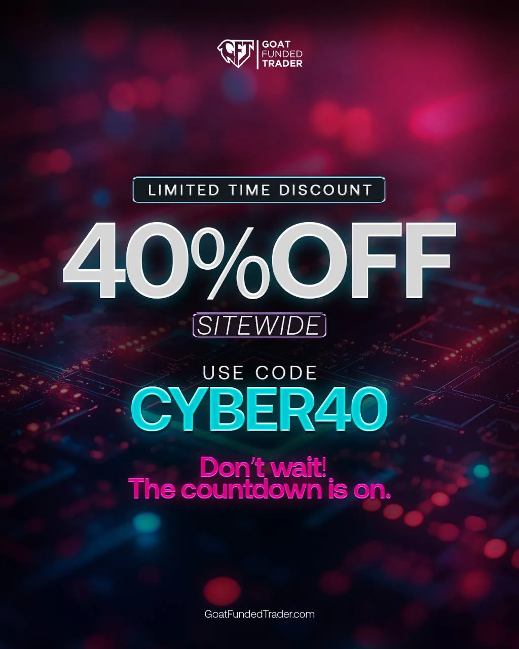Goat Funded Trader ogłasza promocję z okazji Cyber Monday! Skorzystaj z 40% zniżki na wszystkie plany.