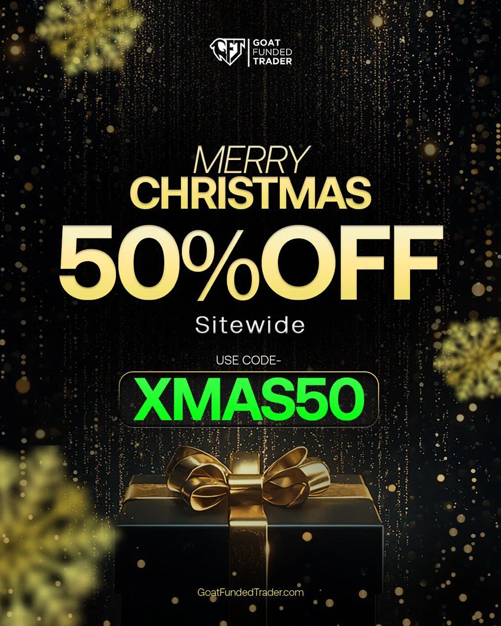 W dniach 25-27 Grudnia 2025 (UTC) możesz skorzystać z 50% zniżki na wszystkie produkty oferowane przez Goat Funded Trader.