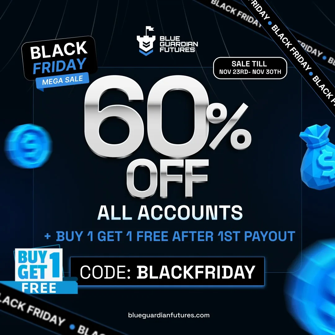 Blue Guardian Futures oferuje promocję z okazji Black Friday: 60% zniżki na wszystkie konta oraz możliwość otrzymania drugiego konta gratis po pierwszej wypłacie!