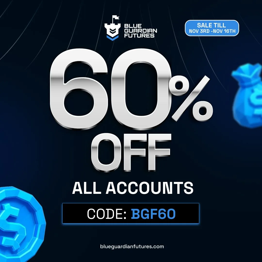 Blue Guardian Futures ogłasza promocję, w ramach której oferuje 60% zniżki na wszystkie konta. Oferta ważna jest tylko przez ograniczony czas.