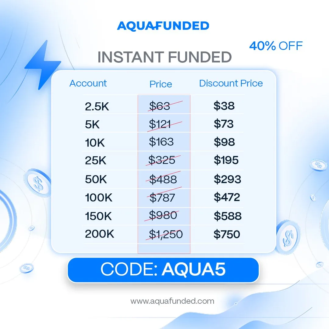 Firma Aqua Funded oferuje 40% zniżki na wszystkie swoje konta prop tradingowe. Promocja jest ważna przez ograniczony czas. Zastanawiasz się nad innymi firmami? Sprawdź nasz ranking firm prop tradingowych i porównaj oferty.