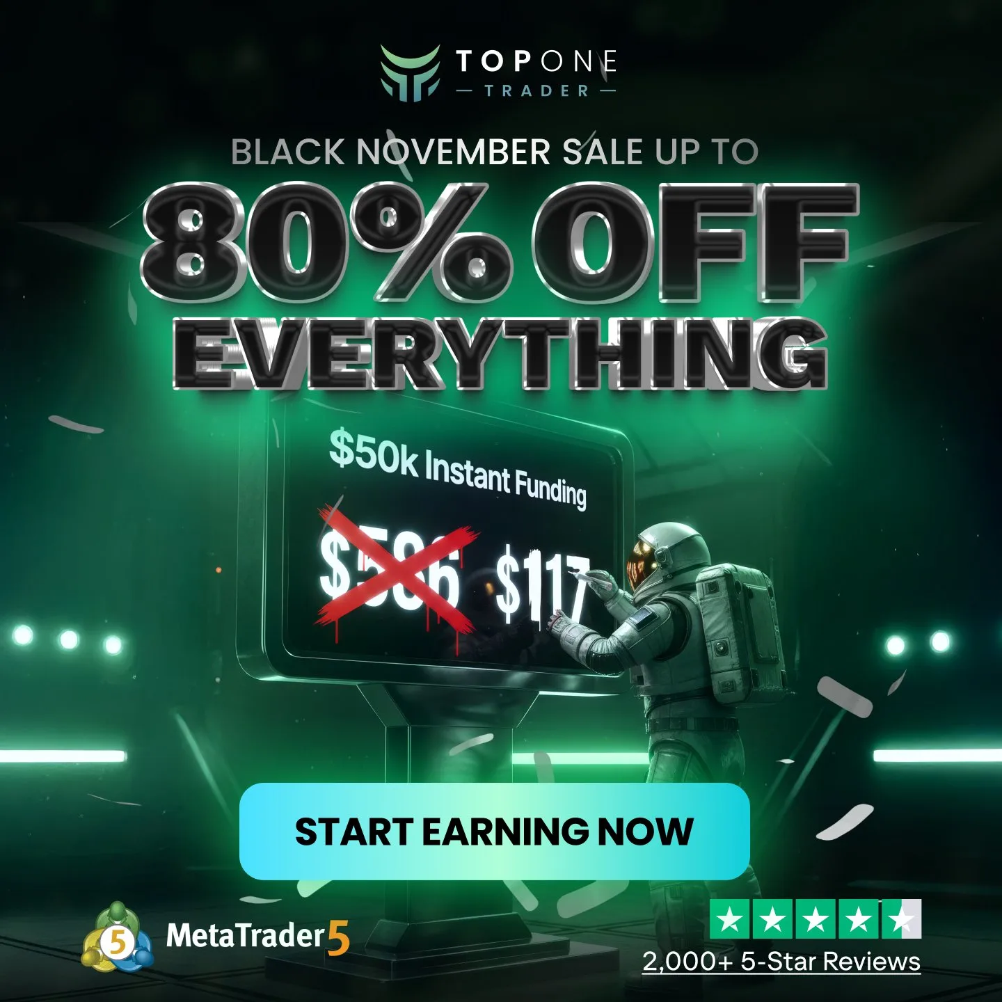 Top One Trader ogłasza promocję z okazji Black November! Możesz uzyskać do 80% zniżki na wszystko, w tym finansowanie instant (natychmiastowe, bez challengu).