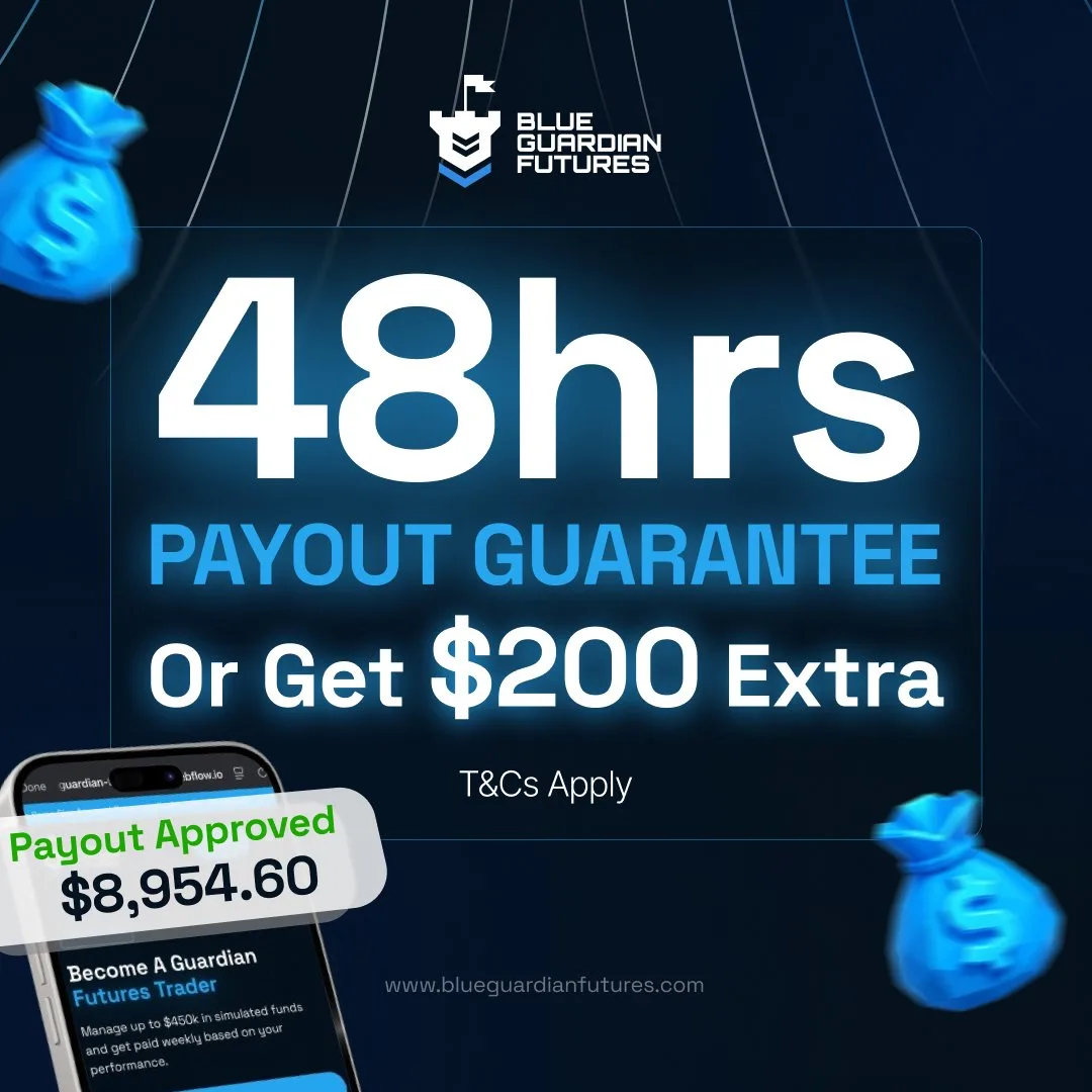 Prop firma Blue Guardian Futures wprowadza gwarancję wypłaty w ciągu 48 godzin. Jeśli wypłata nie zostanie zrealizowana w tym czasie, traderzy otrzymają dodatkowe 200 dolarów.