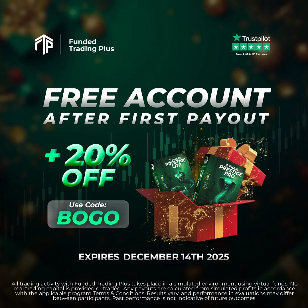 Do 14 grudnia 2025 roku, użyj kodu BOGO przy zakupie dowolnego wyzwania handlowego z limitem stałej straty (static drawdown challenge), a otrzymasz 20% zniżki oraz darmowe konto o tej samej wielkości po pierwszej wypłacie!