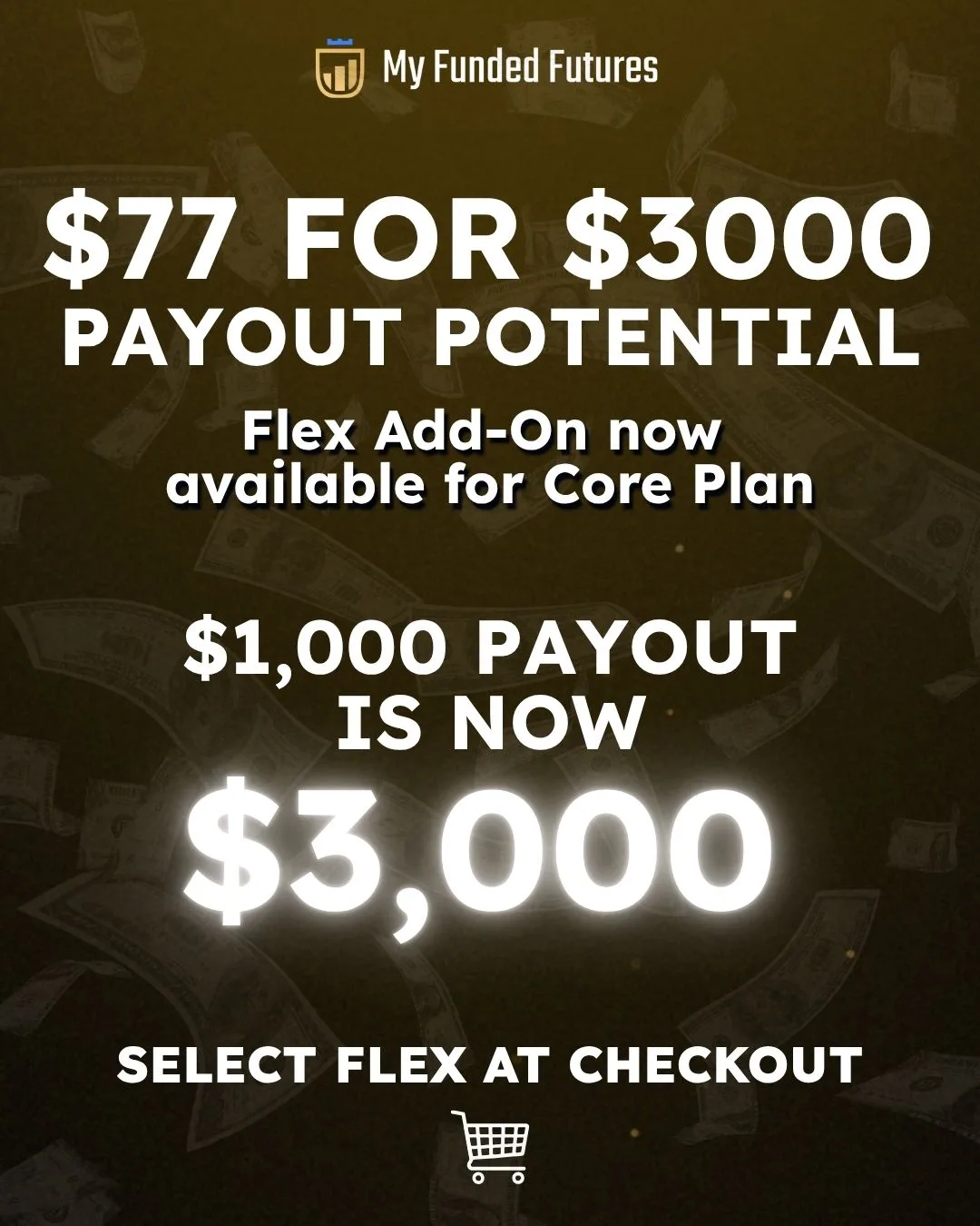 My Funded Futures oferuje teraz możliwość zwiększenia potencjalnej wypłaty do $3,000 za jedyne $77. Promocja dotyczy planu Core, a aby skorzystać z oferty, należy wybrać dodatek Flex przy finalizacji zakupu.