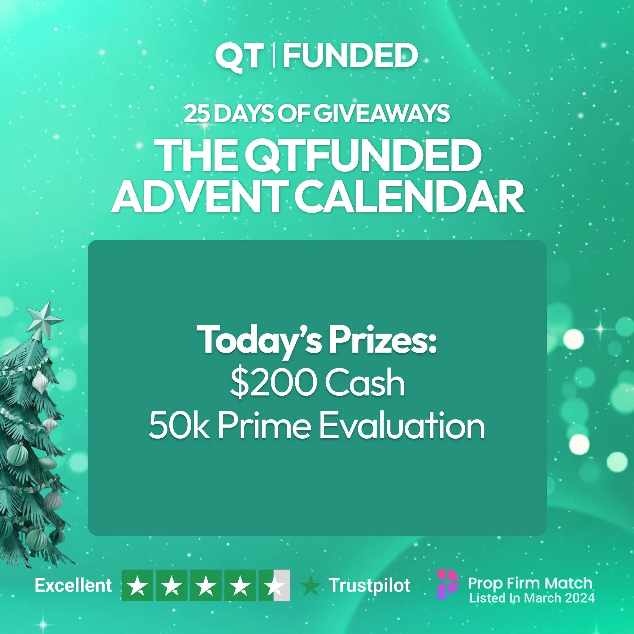 QT Funded kontynuuje swój świąteczny Kalendarz Adwentowy z nagrodami! Dziś, 23 grudnia 2025, możesz wygrać $200 w gotówce lub ewaluację Prime o wartości 50k.