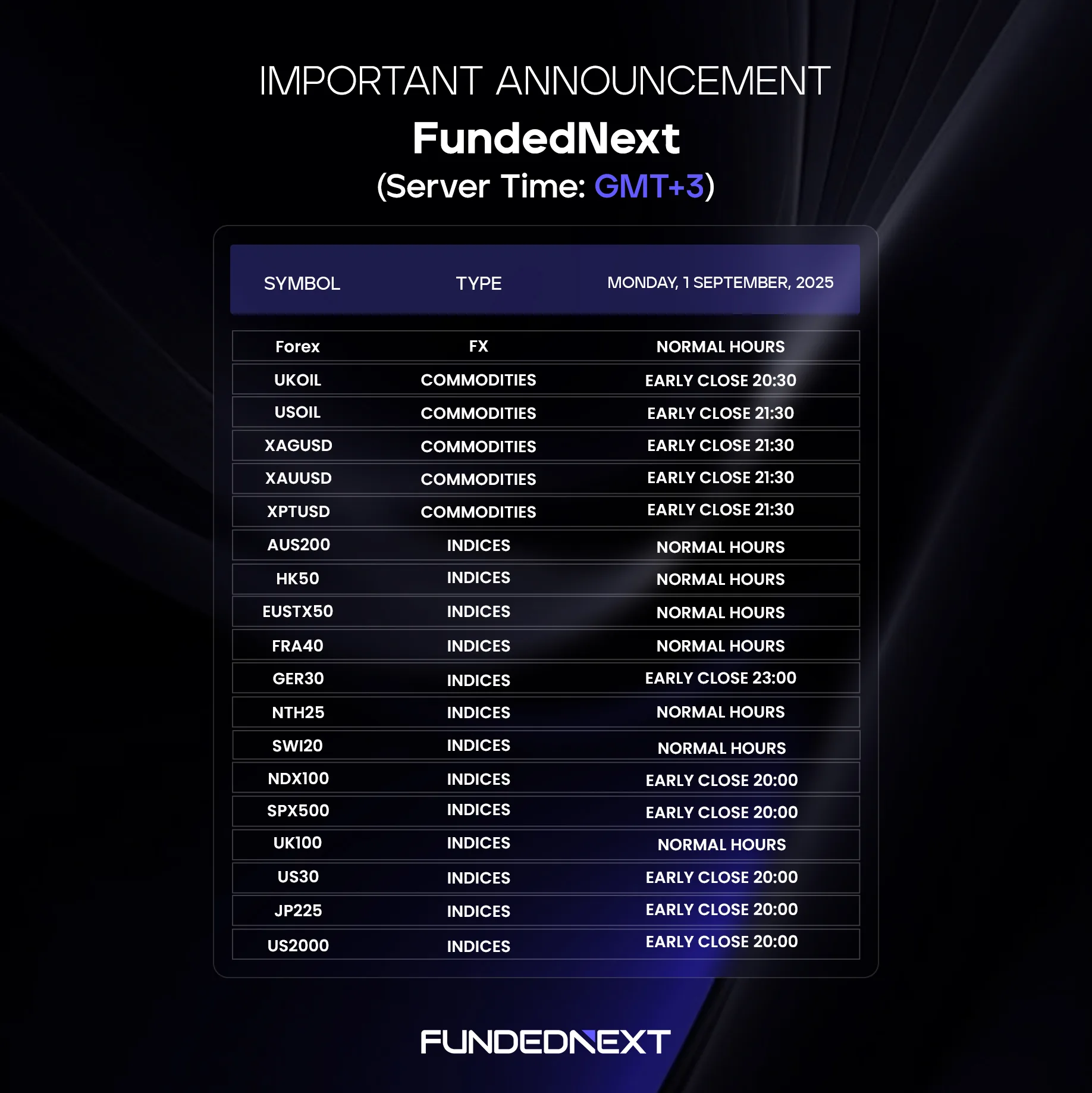 Pamiętaj, że wszystkie godziny podane są w czasie serwera FundedNext (GMT+3). Zalecamy traderom zapoznanie się z tymi zmianami i odpowiednie dostosowanie swoich strategii handlowych. Szczególnie ważne jest to w kontekście zarządzania ryzykiem, o czym więcej przeczytasz w naszym artykule: Zarządzanie ryzykiem w tradingu.