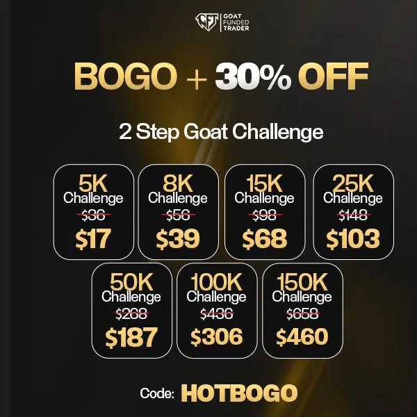 Prop firma Goat Funded Trader ogłosiła promocję „BOGO” (Buy One, Get One Free) na swoje dwuetapowe wyzwania (2-Step Goat Challenges).