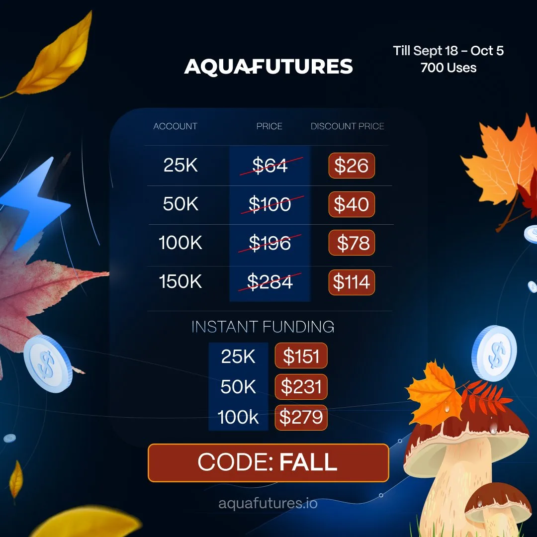Aqua Futures ogłasza rozpoczęcie jesiennych zniżek na swoje konta proptradingowe. Możesz skorzystać ze specjalnych cen do 5 października 2025 lub do wykorzystania 700 kodów rabatowych.