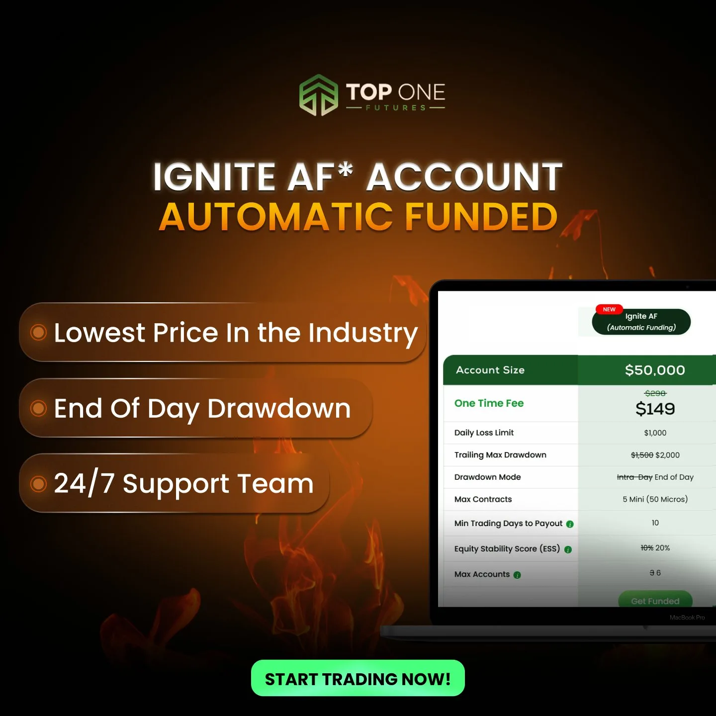 Top One Futures ogłasza promocję na konta automatycznie finansowane „Ignite AF”. Możesz otrzymać konto o wartości $50,000 za jednorazową opłatą w wysokości zaledwie $149.