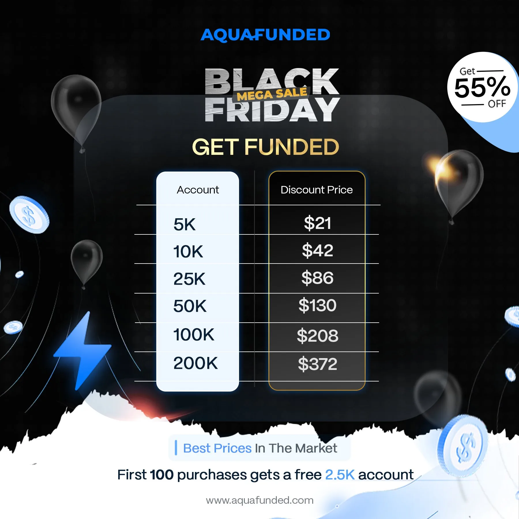 Aqua Funded ogłasza mega wyprzedaż z okazji Black Friday, dostępną tylko przez 48 godzin. Można skorzystać z rabatów do 55% na konta fundingowe, a konta 5K dostępne już za $21!