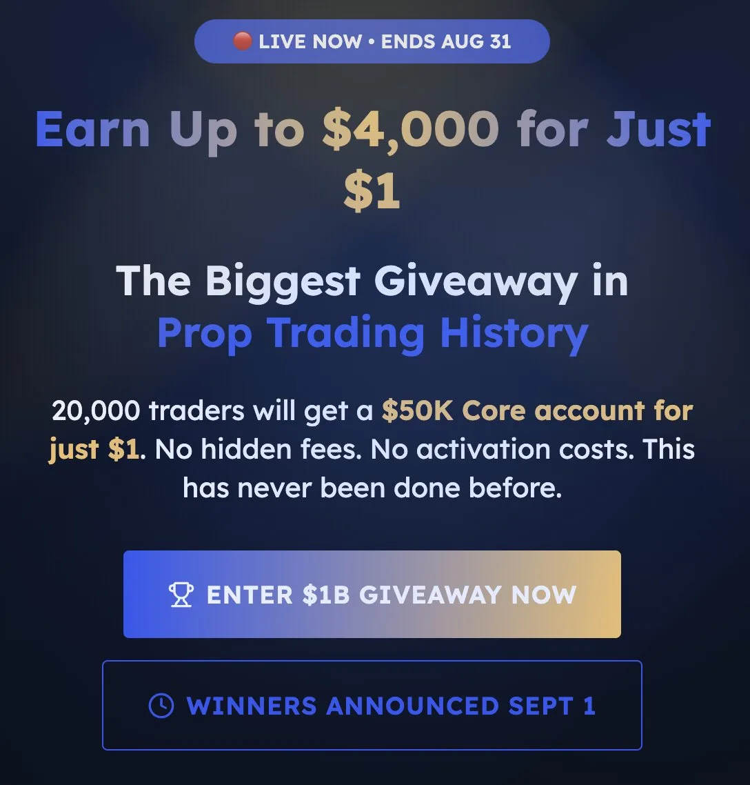 Firma proptradingowa My Funded Futures ogłosiła wyjątkową promocję, w ramach której 20 000 traderów może otrzymać konto Core o wartości 50 000 USD za jedyne 1 USD. Promocja trwa do 31 sierpnia 2025 roku.