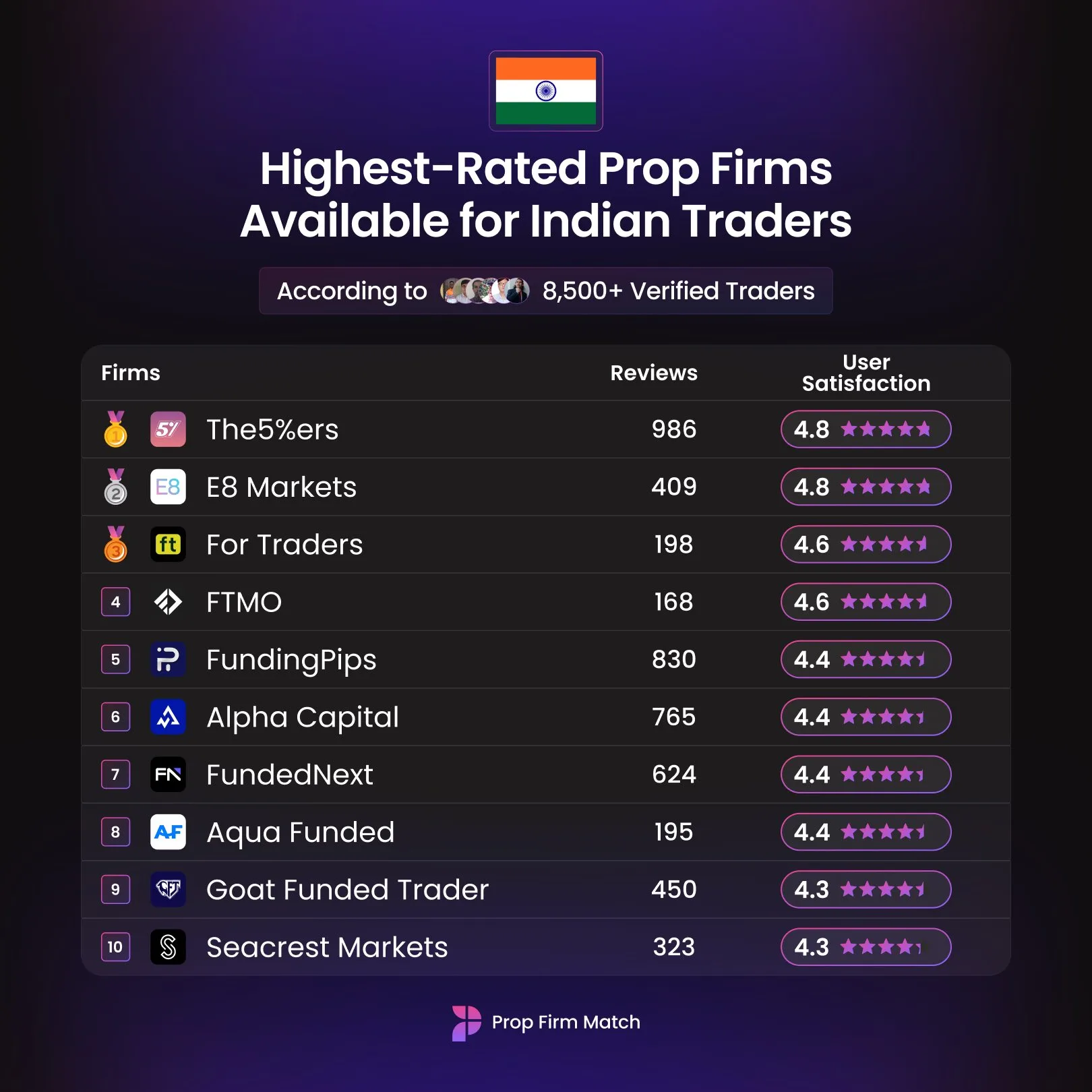 Prop Firma For Traders, opublikowała listę najlepiej ocenianych firm proptradingowych dostępnych dla traderów z Indii. Ranking powstał na podstawie opinii ponad 8500 zweryfikowanych traderów.
