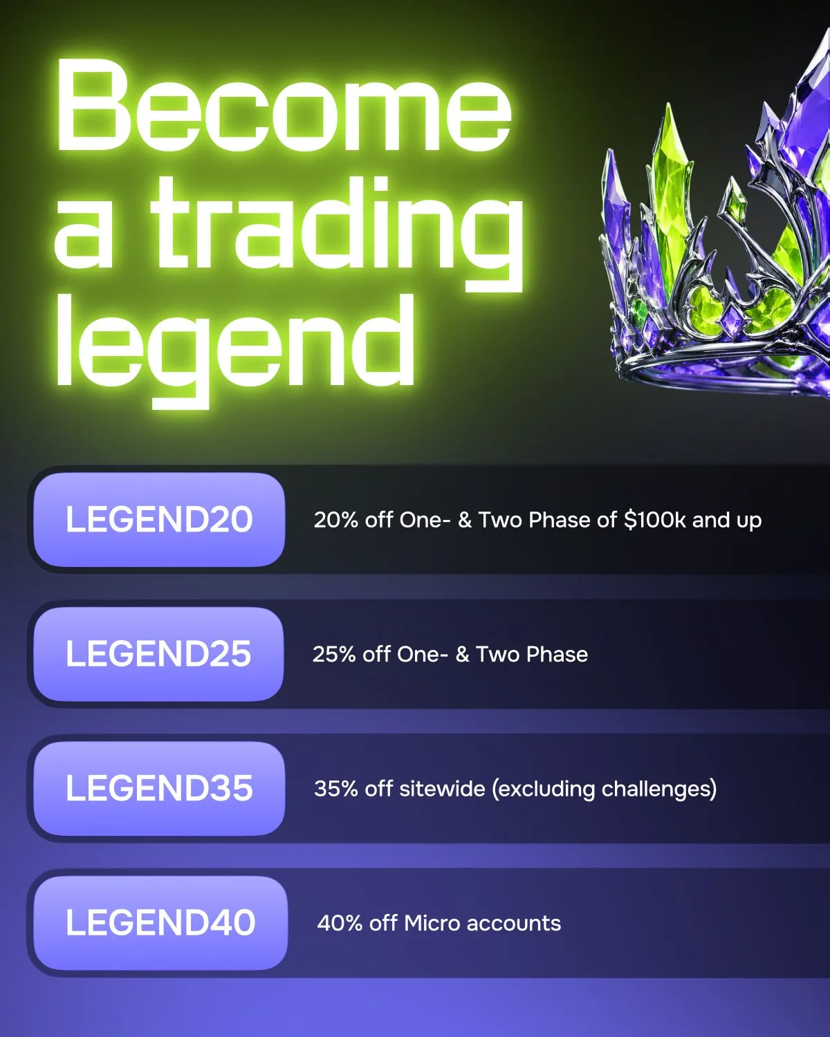 Promocją objęte są różne rodzaje wyzwań i kont, umożliwiając traderom rozpoczęcie lub kontynuację swojej drogi do zostania legendą tradingu.