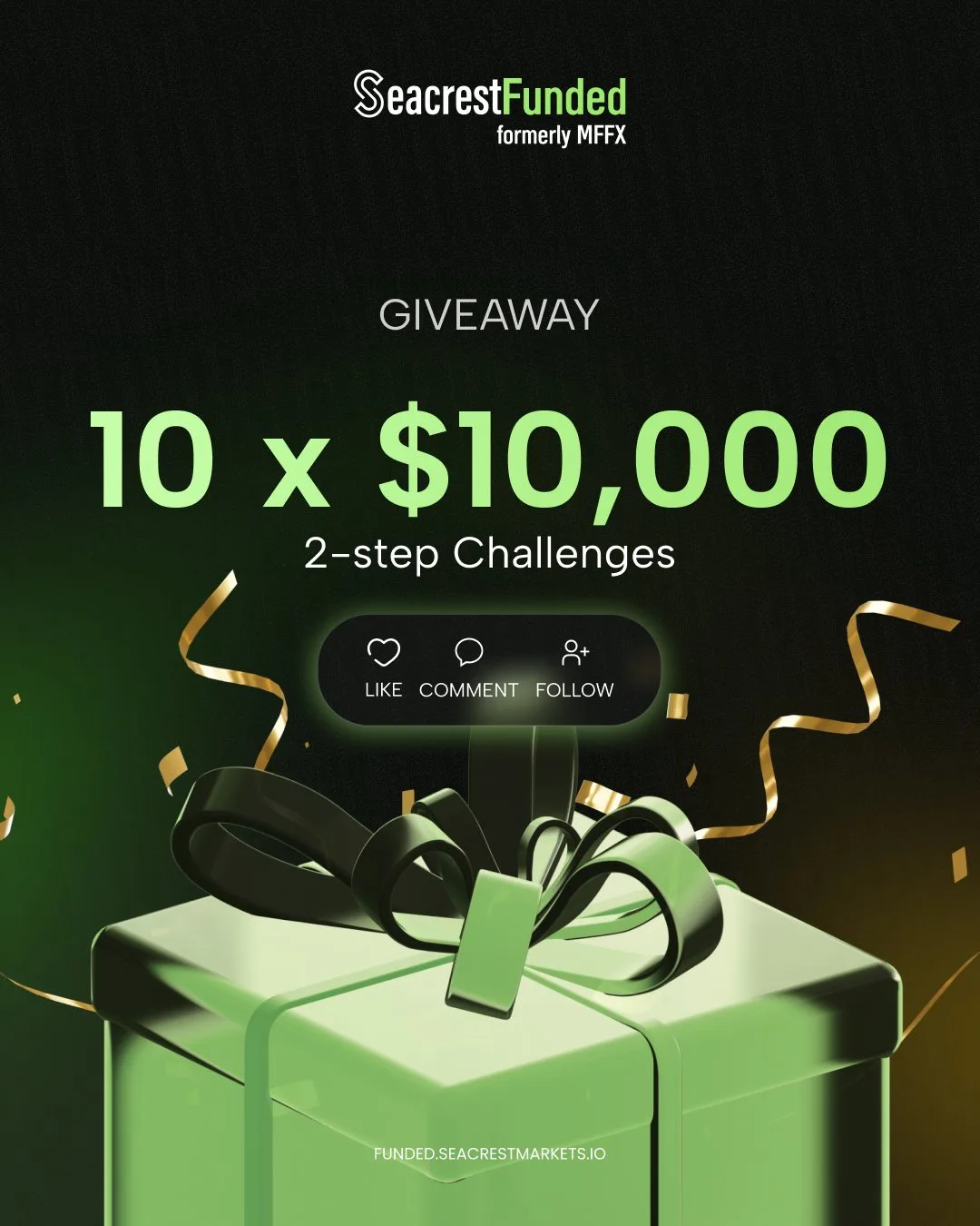 Seacrest Funded rozdaje 10 darmowych kont tradingowych dziesięciu losowym osobom. Konta to 2-step Challenges o wartości $10,000 każde.