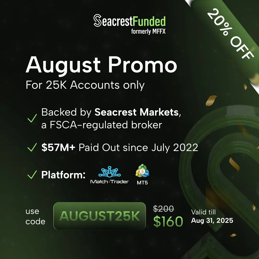 Firma Seacrest Markets prowadzi sierpniową promocję, oferując 20% zniżki na konta 25K. Konto fundowane to doskonała okazja dla traderów, którzy chcą handlować z większym kapitałem.