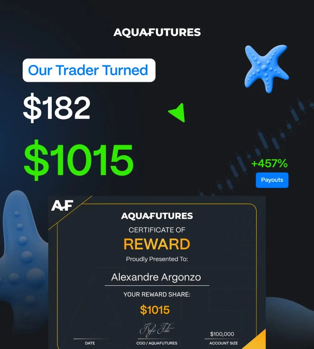 Firma prop tradingowa Aqua Futures prezentuje inspirujący sukces jednego ze swoich traderów, Alexandre’a. Początkując z kapitałem zaledwie $182 w zakupach, Alexandre zdołał wygenerować imponujące $1015 w nagrodach.