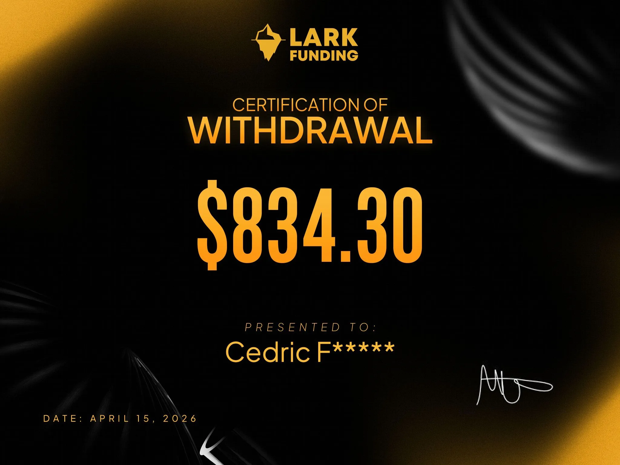 Firma proptradingowa Lark Funding prezentuje kolejny sukces w wypłacie środków dla tradera Cedrica! Kwota $834.30 została wysłana natychmiast, bez zbędnych pytań.