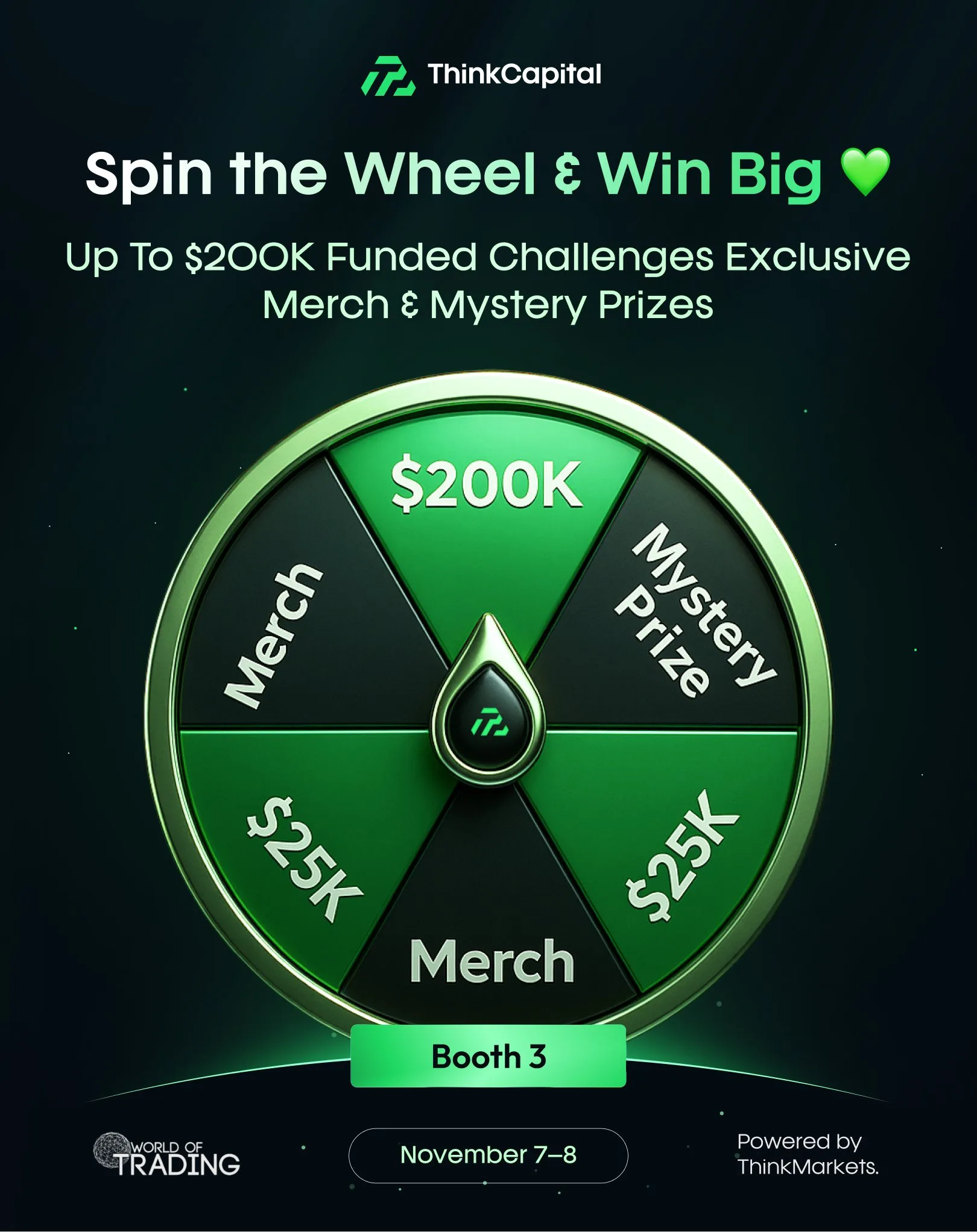 Think Capital zaprasza na swoje stoisko (nr 3) na targach World of Trading we Frankfurcie w dniach 7 i 8 listopada. Będziecie mieli okazję zakręcić kołem fortuny i wygrać szansę na zdobycie 200K Challenge, gadżety oraz tajemnicze nagrody!