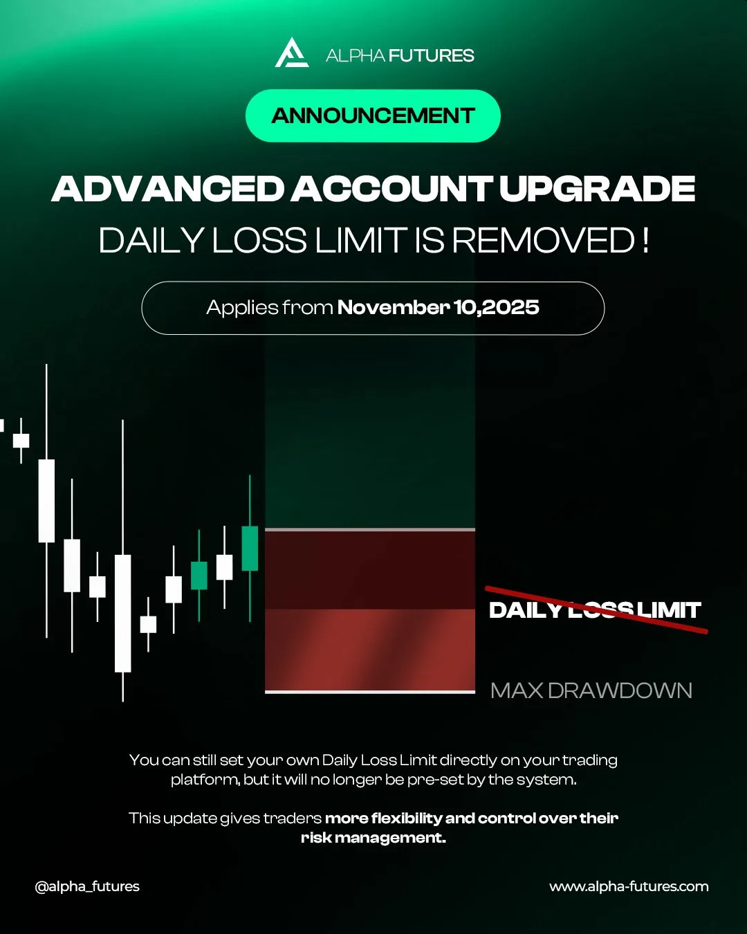 Alpha Futures ogłosiło usunięcie dziennego limitu strat dla kont Advanced. Zmiana weszła w życie 10 Listopada 2025.
